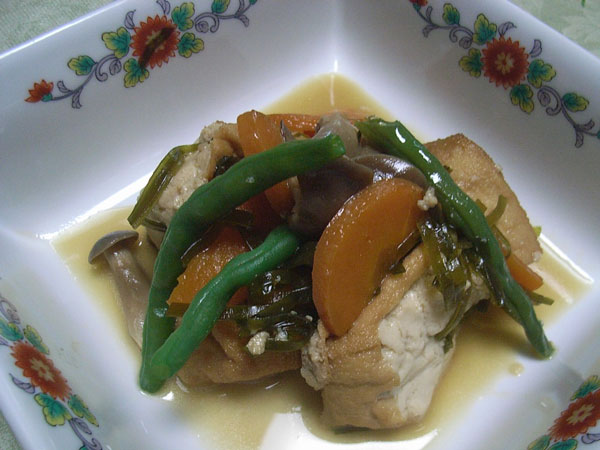 - ◆豆腐を揚げた厚揚げ、適当に脂肪が含まれた豚肉は、良質のタンパク質と脂肪、ビタミン・ミネラルが、野菜・昆布・きのこはビタミン・ミネラルそして食物繊維がとれます。