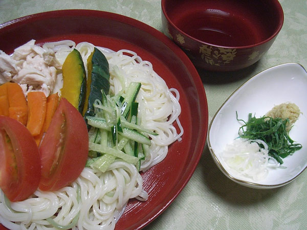 - 1.の麺に2.の野菜を盛り、薬味(大葉・おろし生姜・葱)とめんつゆを添える。