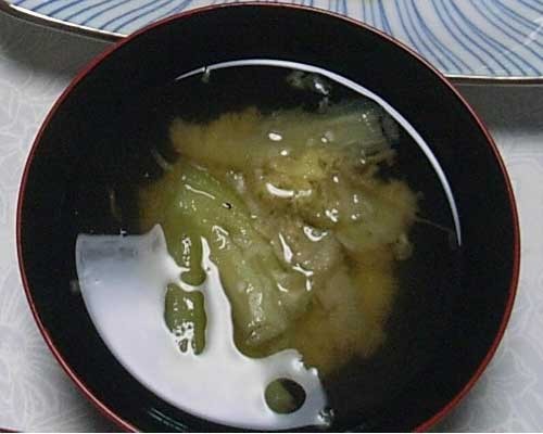 - 煮干、昆布、削りぶしなど好みのだし汁を温め、味噌を溶き入れ、味噌のかおりがしたら、火を止め、1.の椀に入れる。