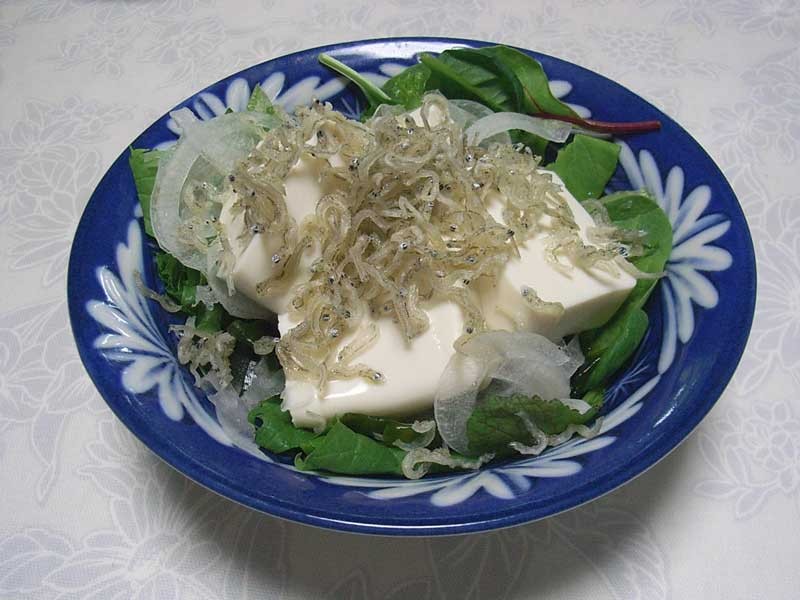 - 器にベビーリーフ、ワカメ、玉葱を入れ、水気を切った豆腐をのせ、シラスをのせる。
