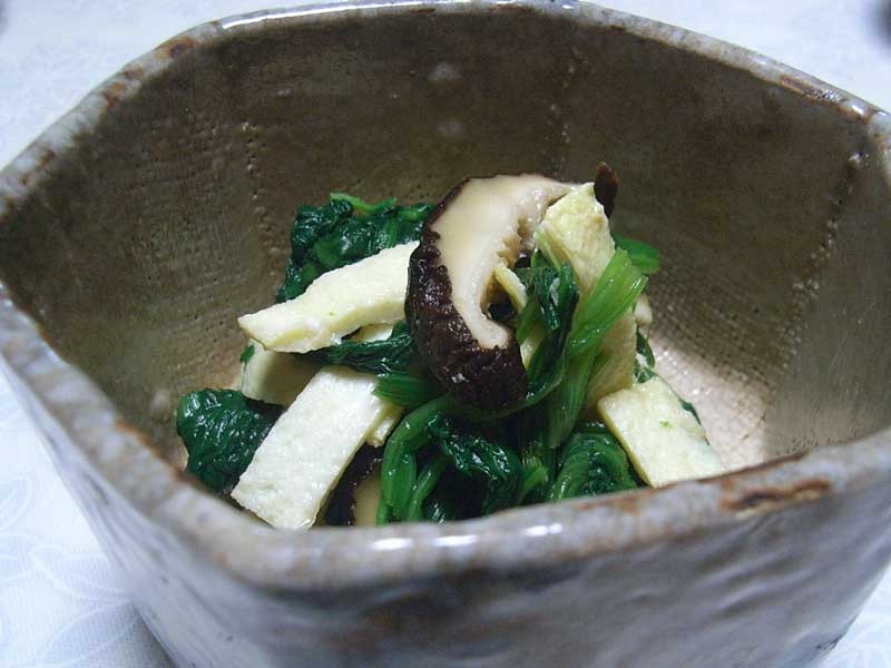 - ◆焼いたシイタケ、ゆずの香り、卵焼きのコク、ホウレンソウの歯ごたえが一つになった和え物です。食材の良さを生かして、薄味に仕上げましょう。