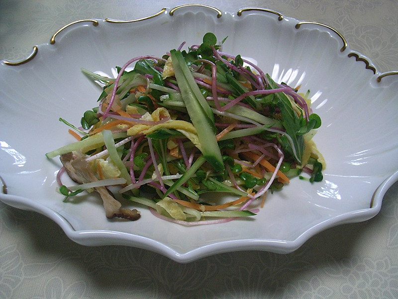 - 野菜はすべてせん切りにする。水菜は野菜の長さにあわせて切る。スプラウト(貝割菜、ブロッコリーなど好みのもの)も野菜の長さにそろえる。生椎茸もせん切りにし、乾煎りする。