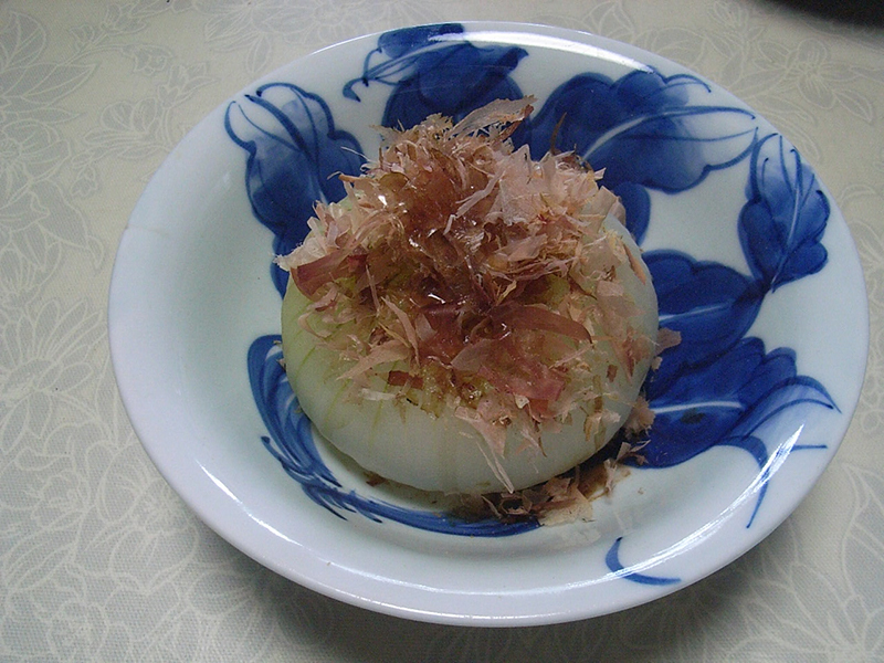 - ■新玉葱は皮をむき、上と下を切り落し、根の部分に切り込みを入れて、お皿にのせ軽くラップをかけ、電子レンジで600W、5~6分で出来上がります。 けずりぶしとポン酢をかけていただきます。