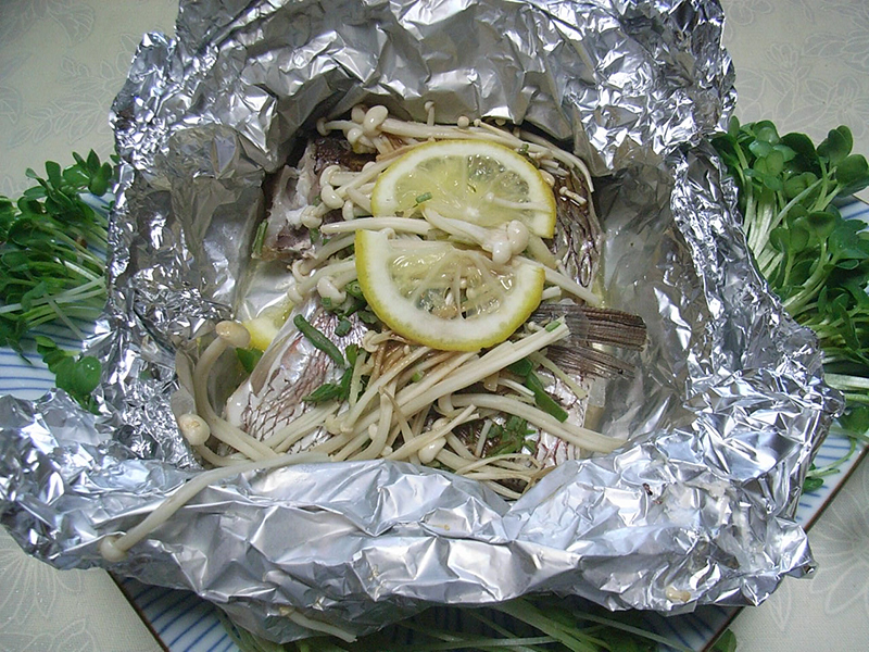 鯛のホイル焼き 白身魚をホイルに包んで蒸しました。