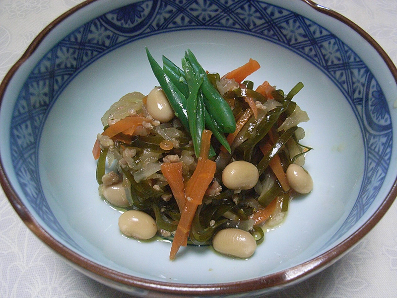 - 鍋に油を入れ、切り干し大根、人参を炒め、ひき肉を加え、煮る。次に大豆、切り昆布、いんげんを入れ味付けする。