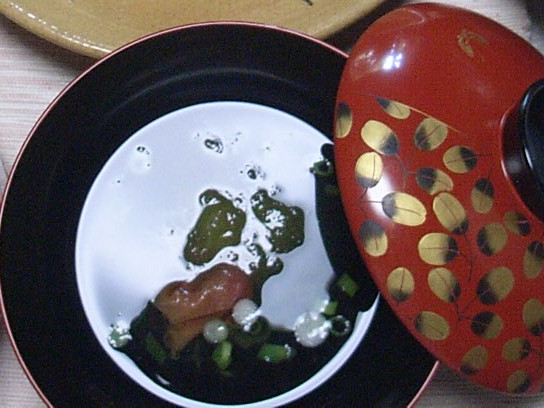 - お椀にとろろ昆布、種をとった梅干しを入れ、熱いだし汁をかけ、葱、生姜汁を入れる。