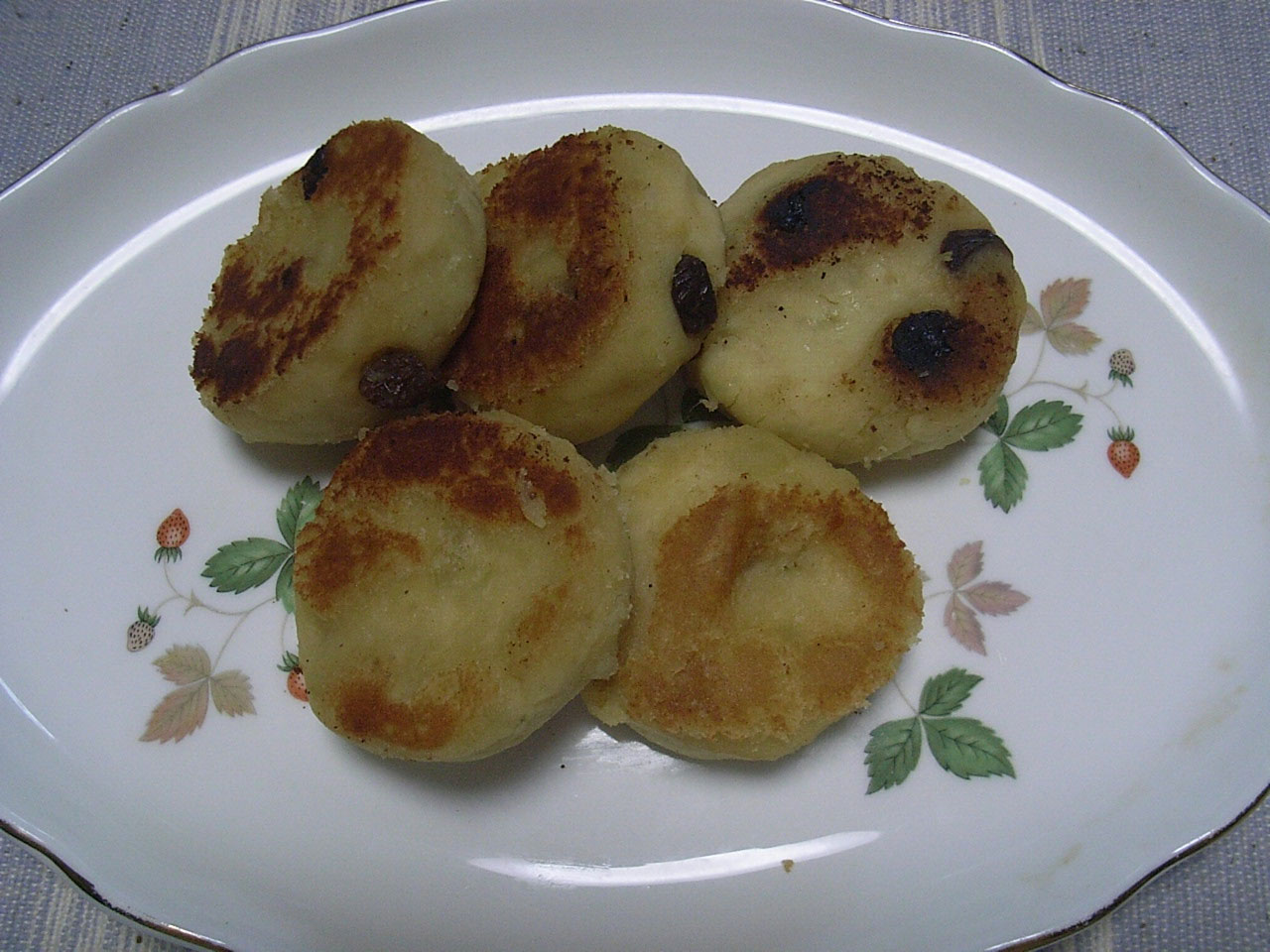 - 蒸かしたさつま芋を熱いうちにつぶして、片栗粉、砂糖、シナモン、レーズンを加え丸める。 さつま芋の水分が少ないときは牛乳で調整する。