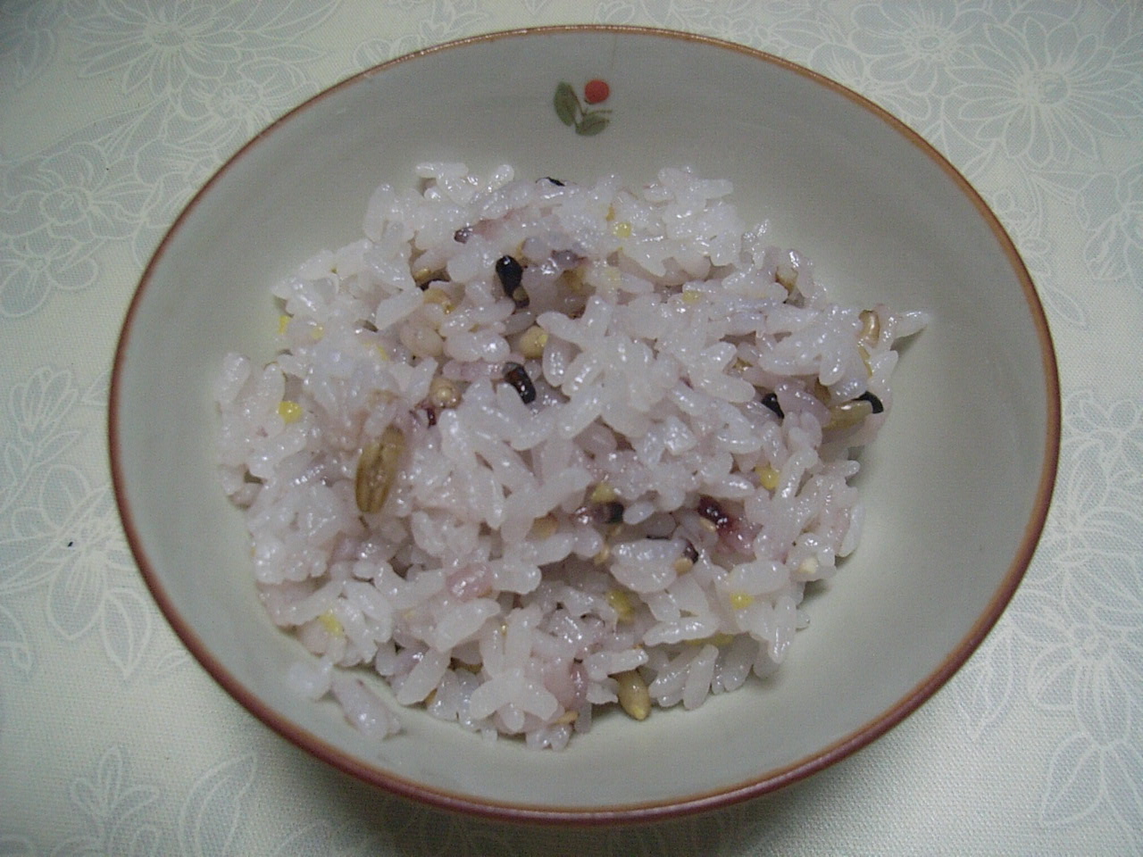 白米よりも食物繊維やビタミン・ミネラル類が豊富な、玄米、麦、赤米 、黒米、大豆、アワ、キビ、ヒエ・・などの雑穀入りのご飯です。白米に混ぜて炊いてください。