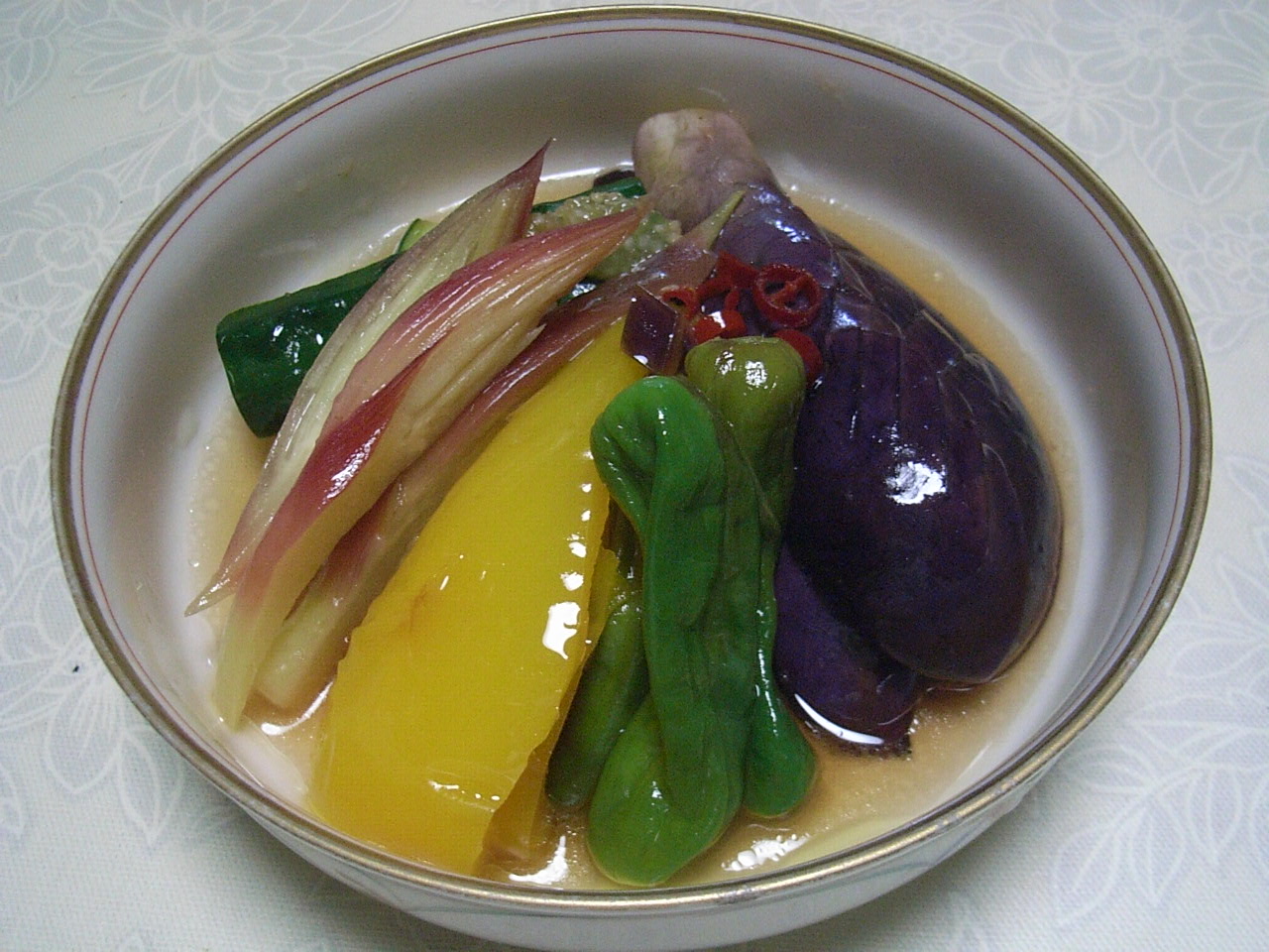 夏野菜の揚げ浸し 野菜をサッと揚げ、調味液に浸すだけで、おいしい。