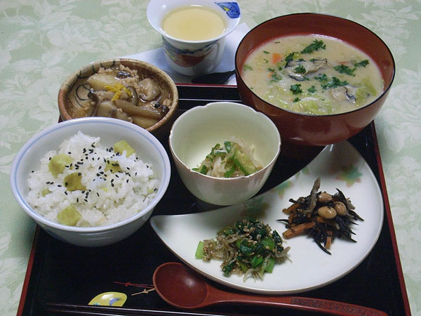 大きな災害のあと、これから起こりうるさまざまな心配、平安な日々の生活、自然の恵みに感謝して向かえる今年の秋。エネルギー源となる米、芋、栄養価の高い秋刀魚や鯖、にんじんや玉葱も秋に収穫されます。そして秋の味覚、きのこ、栗、ぎんなん、柿、柚子、カボス、りんごが待ち遠しい頃です。食べなれた手作りのお料理を、おいしく頂き、静かに落ち着いたよい時を過ごしましょう。